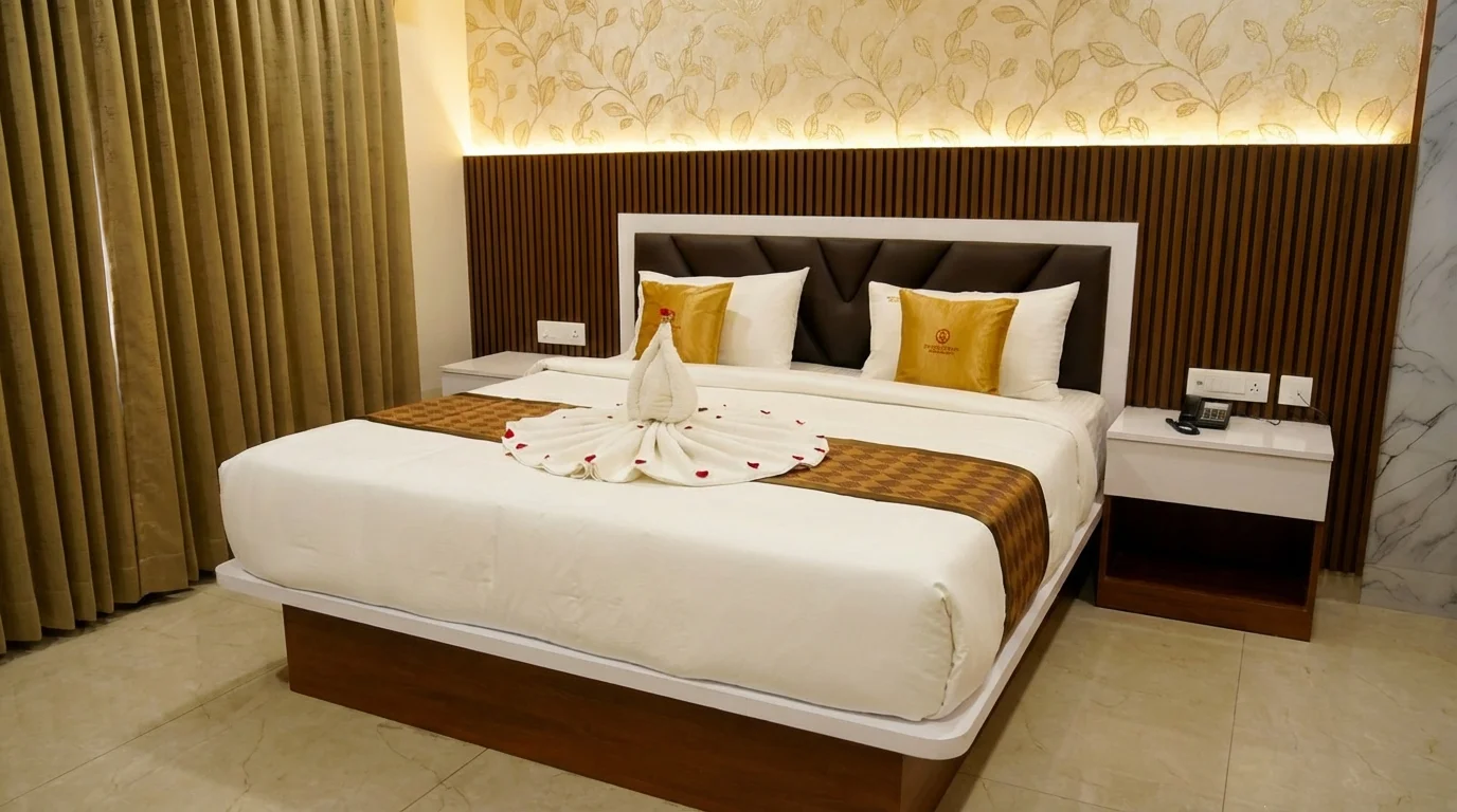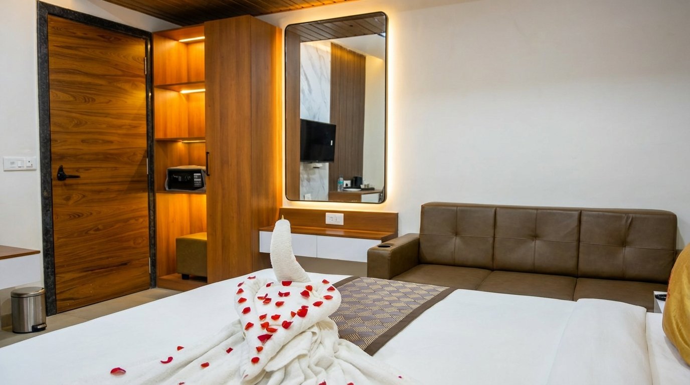 Experience regal luxury in our Royal Suite. Featuring an opulent king-size bed with premium linens, a grand living area with elegant furnishings, a marble bathroom with jacuzzi, and a private balcony with panoramic views.